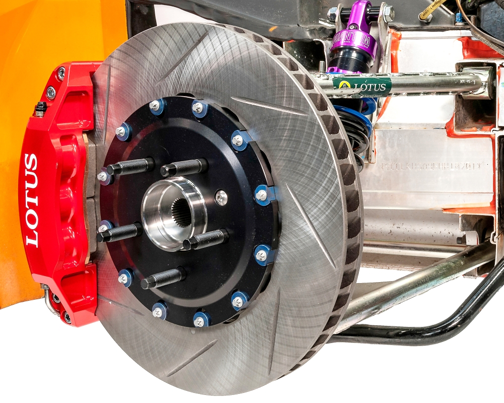 The standard Lotus V6 Discs are 332mm diameter, we have increased the diameter to the largest that will still fit comfortably within the 18" Lotus wheel.